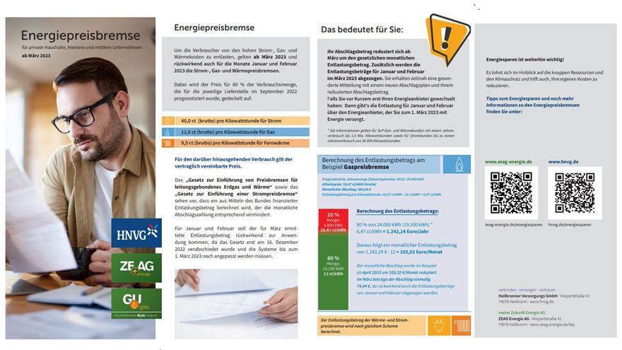 Hier finden Sie den Flyer zu den gesetzlich vorgeschriebenen Energiepreisbremsen zum Downloaden.